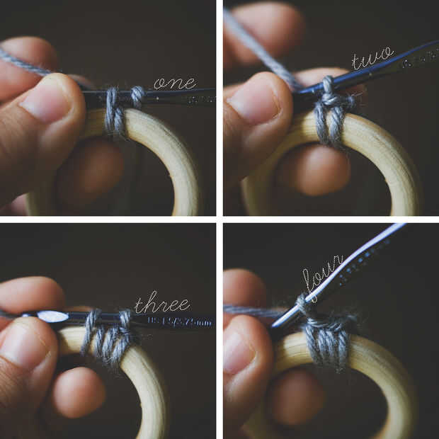 dos: hilado encima y tire a través de ambos lazos en el gancho