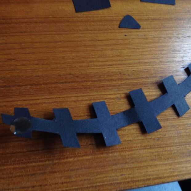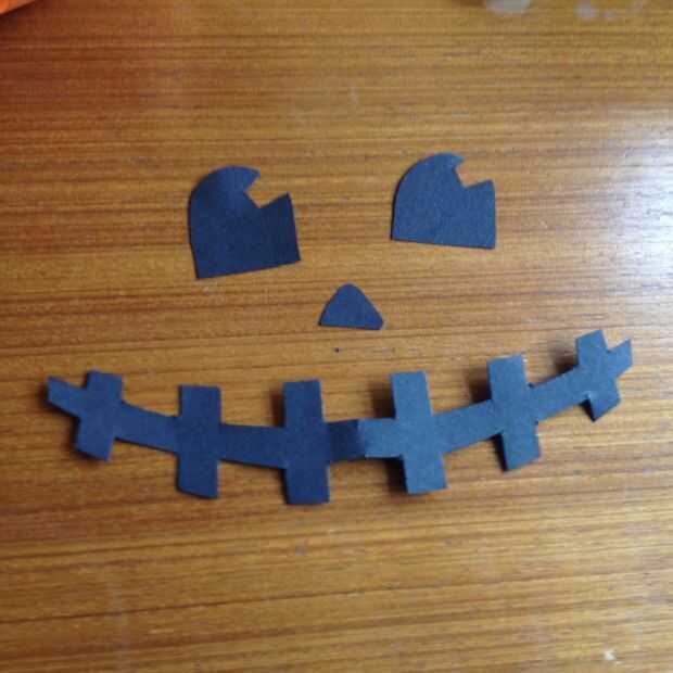 Recorte de ojos, nariz y boca de la tarjeta de negro y fijar con puntos de pegamento.