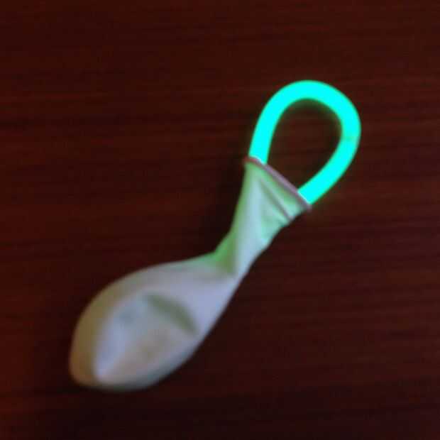 Toma el palillo del resplandor y lo brillante. Delgado palos de resplandor son fáciles de doblar y encajar en el globo como se muestra.