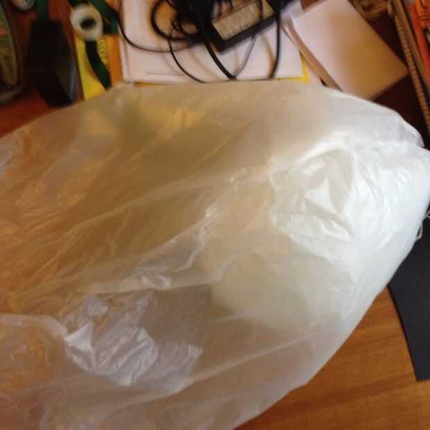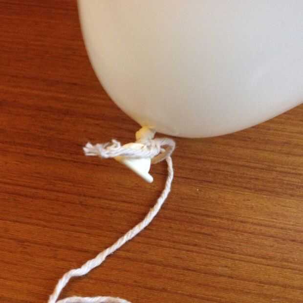 Lazos de alguna cadena en el extremo atado y alimentación a través del pequeño orificio que cortó en la bolsa de basura para que cuelgue alrededor del globo.