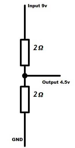 Como se puede ver en la imagen, utilicé dos resistencias de 2 ohmios, pero puede utilizar resistencias de cualquier valor para cortar el voltaje a la mitad como son iguales.