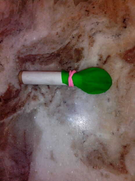 Paso 1: Poner el globo en la pluma cuerpo (cuerpo en forma cilíndrico) y asegurar el globo por poner goma en él.