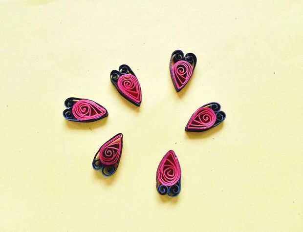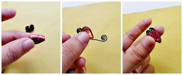 Toma una lágrima y un patrón de espiral doble. Aplicar el pegamento en las partes rectas de la pauta de la lágrima. Desplegar las bobinas de la doble espiral ligeramente y coloque del patrón lágrima puntiagudos justo en el pliegue medio de la doble espiral. Envuelva el patrón de la lágrima con la tira negra en espiral como se muestra en la foto de este paso. Deje que el pegamento se seque.