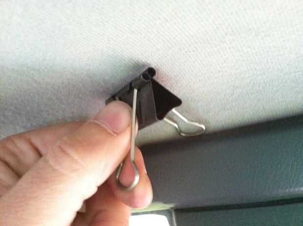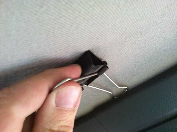 Hay dos maneras de hacer esto. He encontrado que me gusta la boca de la pinza hacia arriba porque me parece que podría ser más amigable con el forro del techo. Como se muestra, todo lo que hacen lugar a una de las asas de alambre entre el guarnecido interior de su coche y el cabeza de cartel!