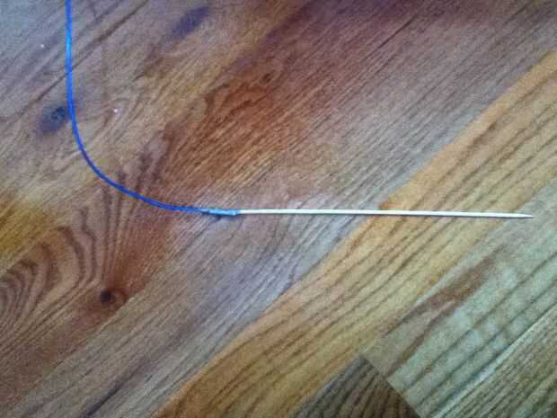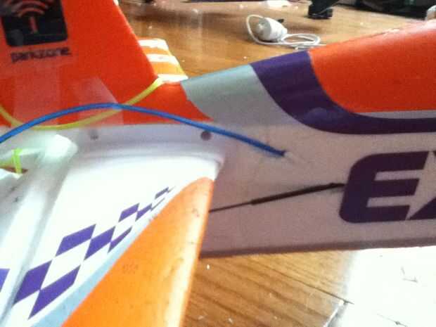 ADVERTENCIA: Si tienes un plano de espuma de poliestireno, asegúrese de que el pegamento es poliestireno seguro o el pegamento se come en la espuma y lo destruyen. Aprendí de la experiencia durante una "reparación" en un avión diferente.  Después de aproximadamente una hora de experimentar con formas de un cable de alimentación a través de una situación difícil, finalmente encontré una buena solución. Todo lo que necesitas hacer es conducto cinta el extremo del alambre al extremo de un pincho y pase por el lugar, como un hilo y aguja. He utilizado cinta adhesiva para que EL alambre no tenga ninguna posibilidad de suelta de la broqueta mientras tira a través. Si tienes un plano de espuma de poliestireno, puede perforar a través el fuselaje con esta técnica de la aguja y el hilo y hacer un agujero exactamente donde usted lo necesita. Si tienes un plano de madera, se necesita un taladro para hacer agujeros. Para algunos diseños, usted no necesitará hacer agujeros en todos.