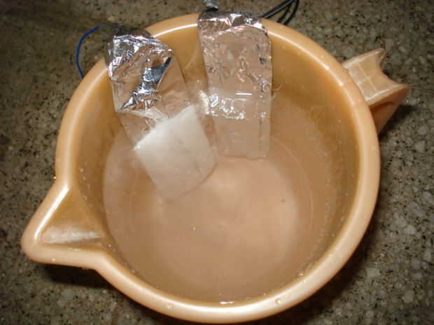 yo no sabía esto hasta que BlimpEnthusiast me ha dicho esto en los comentarios: "instalación de electrólisis gran! En mi electrolizador usar bicarbonato de sodio como electrolito. Cuidado con el gas de cloro que proviene del electrodo positivo al usa