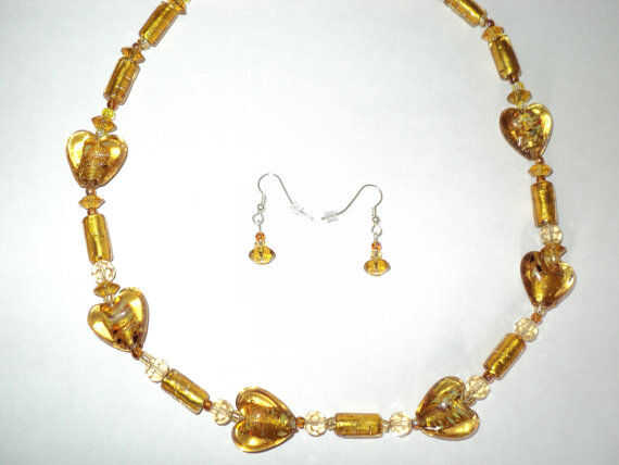 Un collar como este es super sencillo y genial para un bordón de principio. Los suministros que necesitará son: Chafas de 2, 1 cierre, prensar alicates, aproximadamente 25 pulgadas de alambre, una tabla de abalorios y cuentas. Al elegir los granos es una buena idea para mantener el equilibrio de la pieza en la mente. Romper los granos en las siguientes 3 categorías 1) Focal de perlas – las perlas de tus ojos se dibuja primero a, que siempre son los granos más grandes en un collar (son las 6 cuentas de Murano en forma de corazón en el collar se muestra a continuación). 2) ayudante de granos, no como grandes o tan llamativo como granos de la focal, sino que proporcionan un marco para una pieza (son los granos del tubo en el collar se muestra aquí. 3) y variación espaciador granos - rellene los espacios vacíos (son los granos de cristal en el collar se muestra aquí).