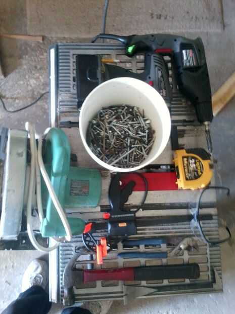 Herramientas necesarias para este trabajo. Sierra de mesa fue muy útil para la fabricación de las placas de relleno, pero opcional. Sierra circular, martillo, palanca, pinzas (para eliminar los clavos), cinta métrica, lápiz, abrazadera y gafas de seguridad (imprescindible). Yo también prefiero dos taladros. Uno un poco perforar agujeros piloto y la segunda con la broca de punta de tornillo. En la foto no es mi lijadora de palma para derribar todos los bordes.