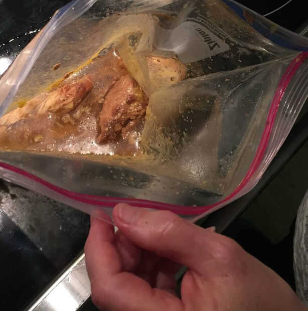 Una vez que haya cortado la carne tirarla en el bote. En este caso nuestra carne era sobra de otra comida, así tomamos todos de la salsa y el jugo de la bolsa y tiró en el bote, así. No habrá un montón de jugo todavía así que vamos a añadir 4 o 5 tazas de agua.