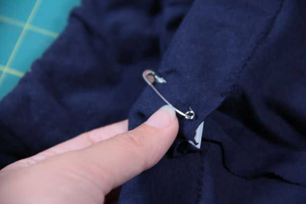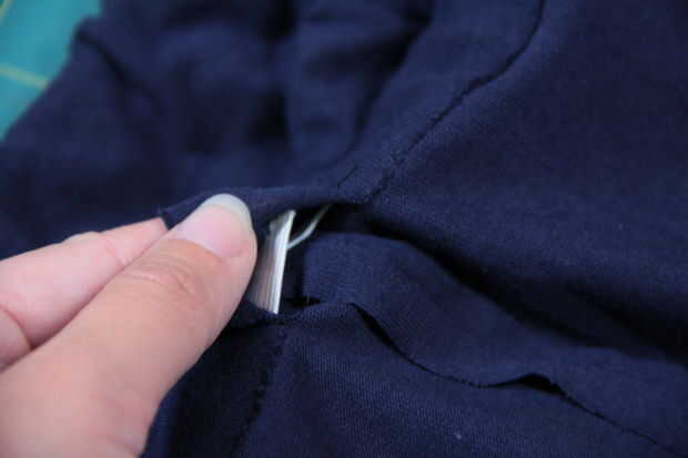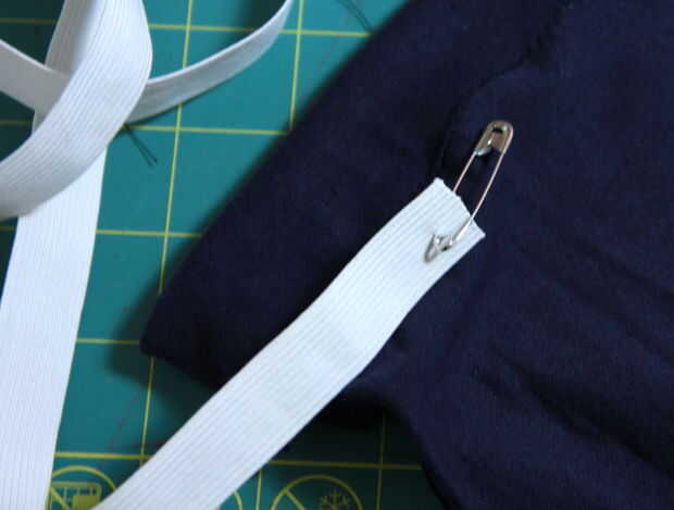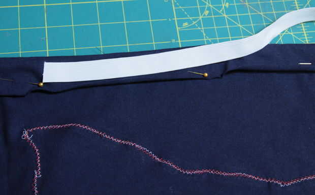 Prender el elástico con un alfiler y utilice esta guía a través de la carcasa. Ahora recoger ambos extremos del elástico y asegúrese de que se solapen. Lo hice en la costura que había creado previamente por lo que no sería visible. Prender las piezas junto con la falda y coserlas juntas. Para terminar, coser por el boquete que había dejado anteriormente. Aquí es otra manera de añadir la cinta elástica.