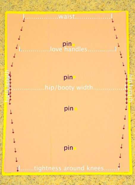 5. tomar todas las medidas nuevas (ej.: 14.5 pulgadas) y en el centro uniformemente por el centro de la tela doblada en sus lugares apropiados - marca!!!!!! Al igual que la primera imagen muestra! Si desea agregar un poco extra por si acaso, es sabio porque siempre se puede tomar! Asegúrese de que tener en cuenta la longitud de sus caderas y la longitud de la cintura natural a la parte superior de las caderas. Tapper de la parte inferior de las caderas a las rodillas.