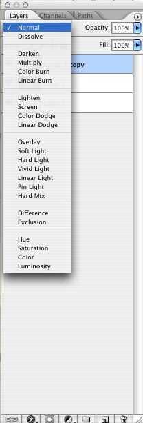 - Asegúrese de que su en la capa superior, haga clic en la casilla, y usted debería ver una gran variedad de nombres (realmente llamado modos de fusión), haga clic y jugar hasta llegar a un efecto que se ve bien a usted.