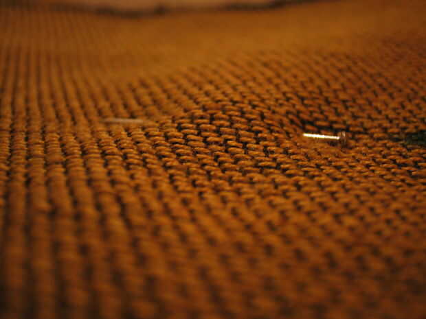 con la parte posterior de la proyección de material, alinear sus marcas y prender los dos extremos juntos