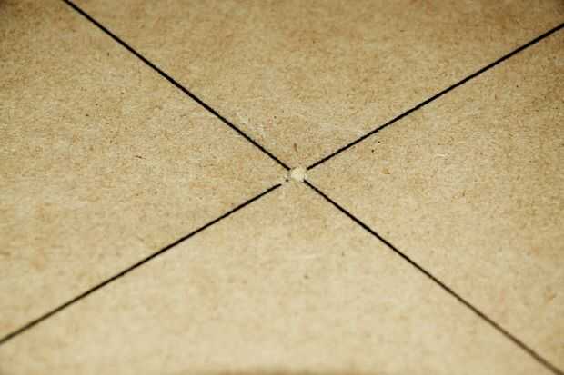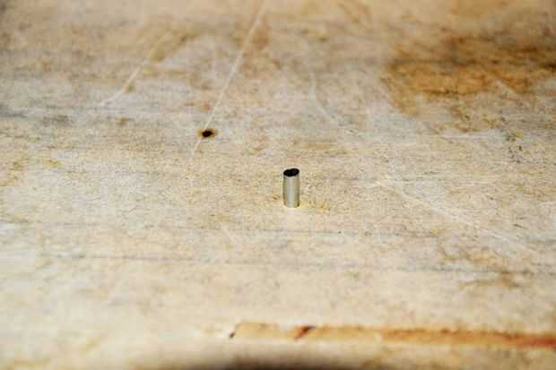 Perfore un agujero apenas más grande que el eje de un clavo. Taladre un agujero opuesto en el tablero de la mesa su router está conectado a (sólo sugiero hacerlo si está usando un viejo pedazo de Beat-up del MDF para su mesa de trabajo como yo). Corte de uñas con la cabeza y utilizar como el eje del círculo.