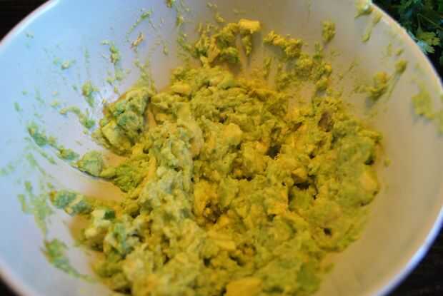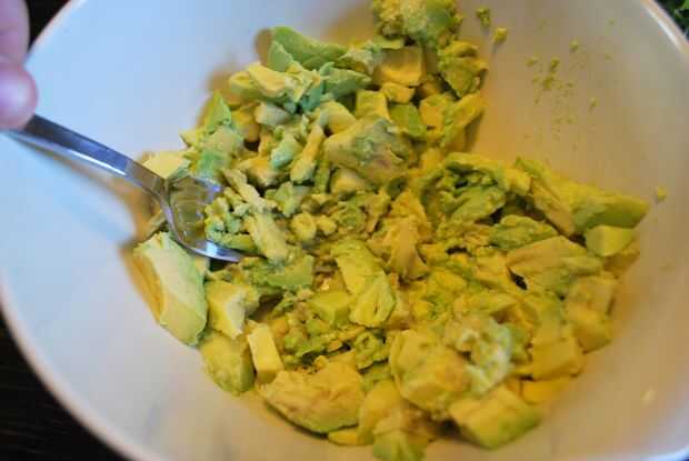 Retire los cubos de aguacate y poner en un tazón. Utilice un tenedor para puré hasta tu constancia deseada. No tienes que volver loco que aquí, mezclamos el resto de los ingredientes seguirá puré para arriba.
