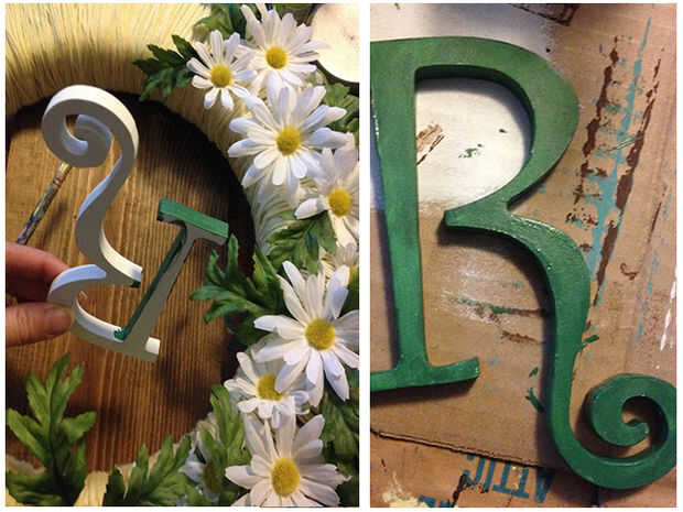 Quería añadir una R de Rodgers, por lo que he encontrado un divertido R en la tienda de artesanía de Michael y pintado de verde para que coincida con el verde en las margaritas de shasta. Entonces encontré que un marco de madera para utilizar como fondo para el R. corte He pintado blanco para ayudar a mostrar la R verde en la corona.
