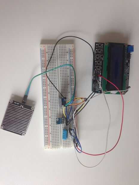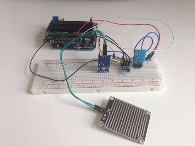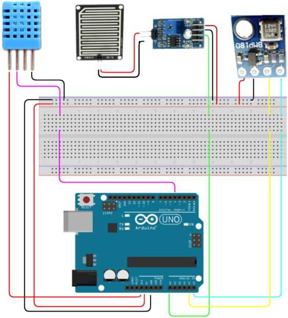 Ahora que tenemos todas las partes es tiempo de construir la estación y conectar todos los componentes. El esquema a continuación muestra cómo conectar los sensores a la placa y el Arduino. La razón de que utilizar un protoboard en lugar de conectar directamente los sensores es debido a la falta de pines de 5V y tierra en el Arduino.