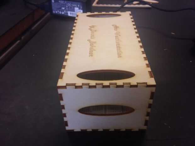 Después de acabado el código y los casos de impresión tuve algún tiempo a la izquierda. Durante un rato miré en la estación de tiempo pensando qué hacer. Entonces me golpeó. Todos los artículos tenían casos excepto la estación sí mismo. Así que esa tarde diseñé un caso personalizado para la estación sí mismo. Después de cortar con el cortador del laser equipado como un guante.