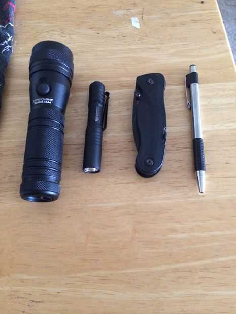 Primero de todo es mi IPhone (no fotografiado). Pertenece realmente en el bolsillo del carpintero de mi jeans cuando no esté en uso. El siguiente es linterna Streamlight Twin Task. Es un 3 AAA aluminio, resistente a la intemperie linterna con 5 modos. Láser, 5 LED brillante, laser y LED, solo LED (tal vez UV?) y off(club). Yo recientemente intercambió esta luz voluminosa hacia fuera para la linterna Streamlight Micro LED. Esta es una luz de AAA LED única que es asombrosamente brillante. Hay dos cosas que me gustan de esta luz. En primer lugar, es más pequeño, usa menos baterías, casi tan brillante y tiene un clip de cinturón reversible. El clip es en forma de S que puede clip a un sombrero y convertirse en un faro. (Aman). El cuchillo es el Leatherman cráter. Es una hoja 4" combo recto/Sierra óxido negro. Yo también con un destornillador Phillips y plano y un caribiner que dobla como un abridor de botellas. SIEMPRE intento mantener una pluma en mí en todo momento. Mi instrumento de escritura de elección es la cebra Z-301 Bold. Es una pluma de acero inoxidable con un extremo de la punta med (1,6 mm). El rodillo más grande permite un movimiento de asfixiar y llego a encontrar más cómodo y durable que otras plumas.