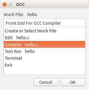 Se trata de una simple interfaz gráfica para el compilador GCC de Linux. Es un archivo de comandos de bash con el comando de zenity. Si no tienes zenity y utiliza un sistema basado en Debian (Ubuntu) estará en los repositorios.