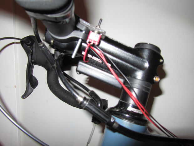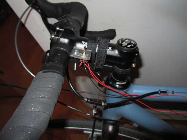 PIC 3: Utilizar una de las tiras de Velcro que vinieron con una de las luces y Envuélvala alrededor de la batería y el marco. Debe ser lo suficientemente largos para dar la vuelta un par de veces. Entre adhesivas Velcro y la cinta, la batería debe ser segura en este momento. Si es todavía no sólido, échale alguna cinta aislante.