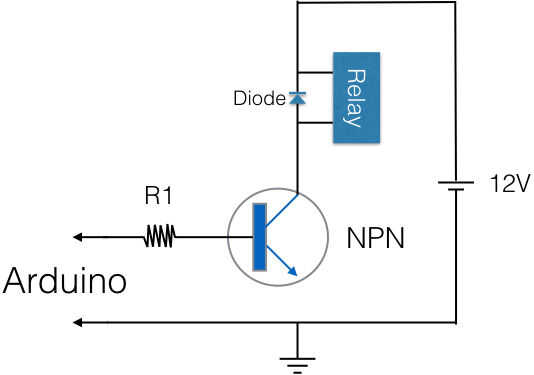 Una vez más, si tienes un relé de 5V, no es necesario esto. Si tienes un relé de voltaje más alto, usted puede conducirlo de 5V usando un transistor NPN. Hay varios tutoriales maravillosos sobre cómo construir el circuito del conductor. Véase, por ejemplo: