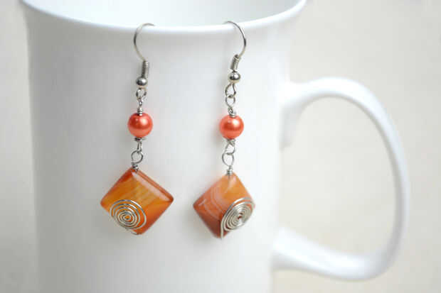 Alegrar es aburrido joyería moldeada con espirales de alambre de metal fresco. Este par de pendientes hechos a mano consiste simplemente en un grano de la perla, grano de Murano de un rombo, un gancho de pendiente bien preparados y unas pocas pulgadas de alambre de latón plata. Todos los suministros necesarios para hacer de esta cuentas diseño de la joyería están disponibles en cualquier tienda de artesanía.