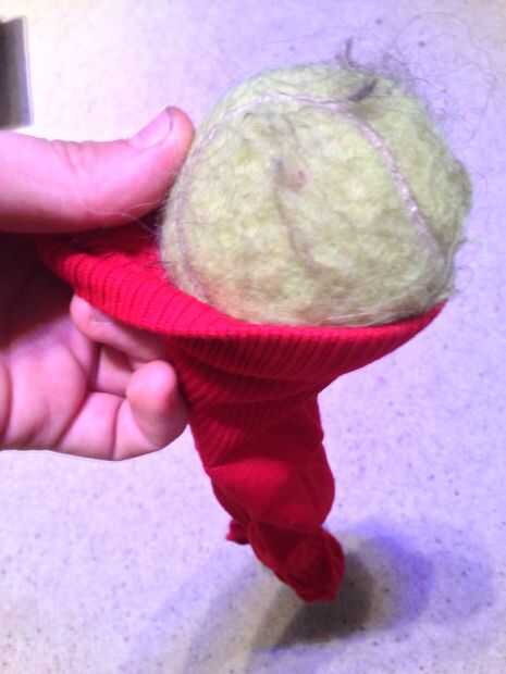 Poner la bola en el calcetín y empuje hasta el fondo. Usted podría dejar en el centro y atar nudos a cada lado, pero mis perros lo prefieren al final :)