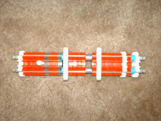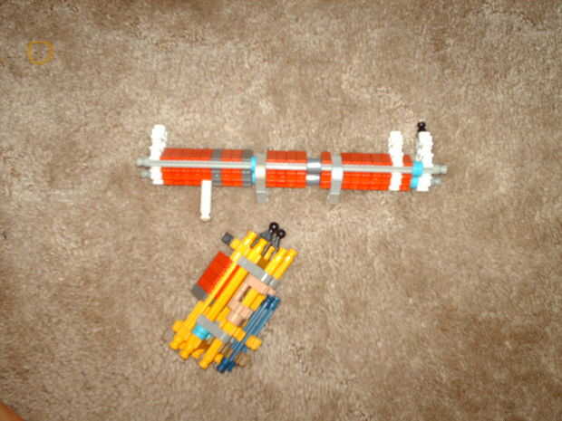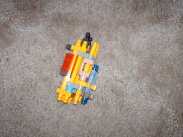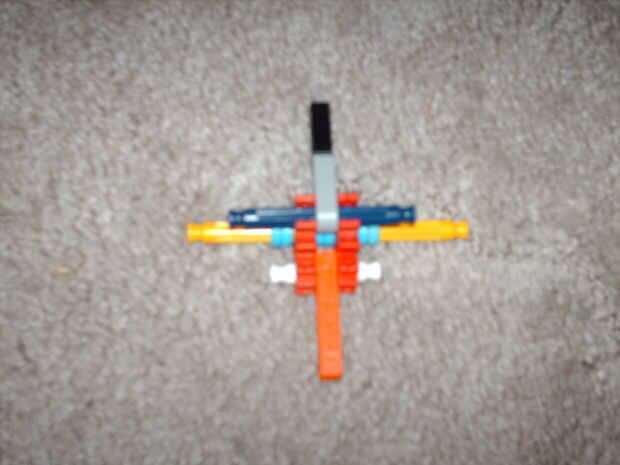 Esta es el verdadera arma de K'nex más pequeño. Y NO UN BLOQUE! ¿Awesome, derecho? No es sólo el más pequeño, pero utiliza menos piezas. 3 piezas para hacerlo. Una cosa naranja (no sé lo que se llaman) y 2 espaciadores azul (uno por disparo, uno para