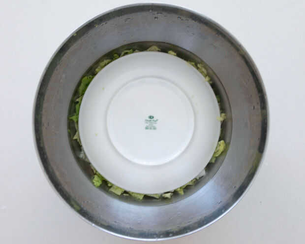 • usando una placa cerámica, pesan la col en la salmuera por 30 minutos