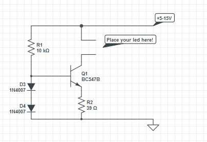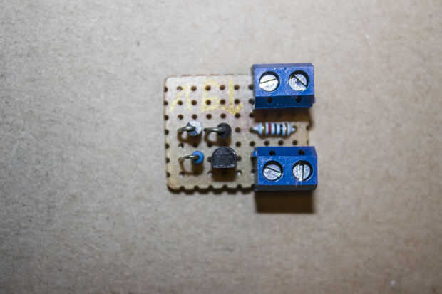 Ahora soldar entre sí, utilice el esquema. Importand, octavo en el transistor don´t permutar las piernas o tal vez se curents alrededor de 200mA (he probado!! ;)). El circuito impreso que utilicé es 7 x 8 agujeros pequeño, usted puede hacer más pequeño cuando no utilice los terminales, un elemento de enfriamiento no es necesario, porque no se calentará eso mutch.