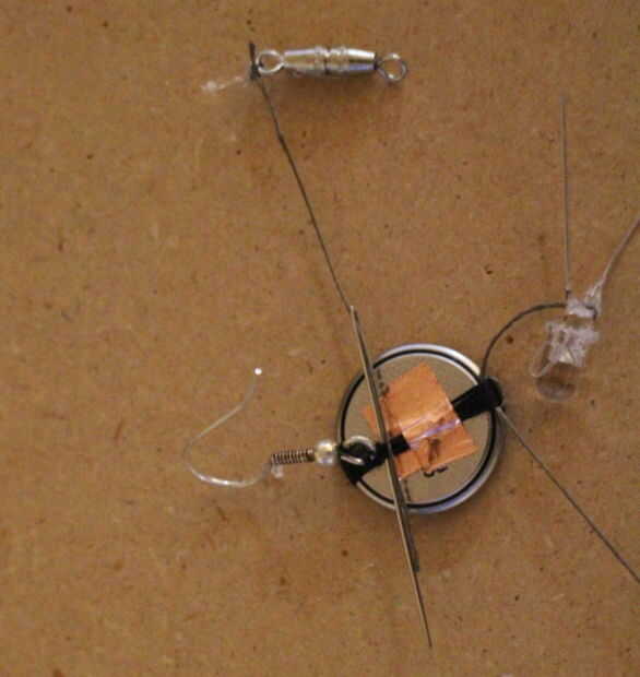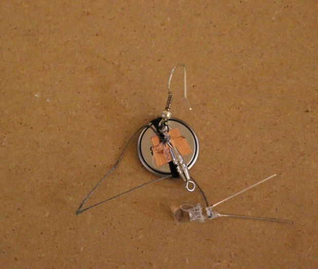 Sujete el broche (también conocido como interruptor) en la parte posterior de la batería w / ~ 6 pulgadas de hilo conductor de la misma manera que la parte posterior de la pendiente fue unida: Enhebre el extremo del pendiente por la banda de hilo en la batería, por encima de la cinta y tire firmemente. Repetir al menos cinco veces. Un nudo y pegamento caliente el hilo para sujetarlo.