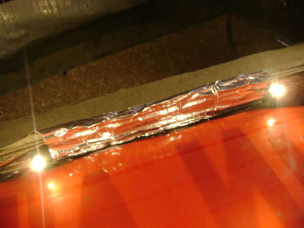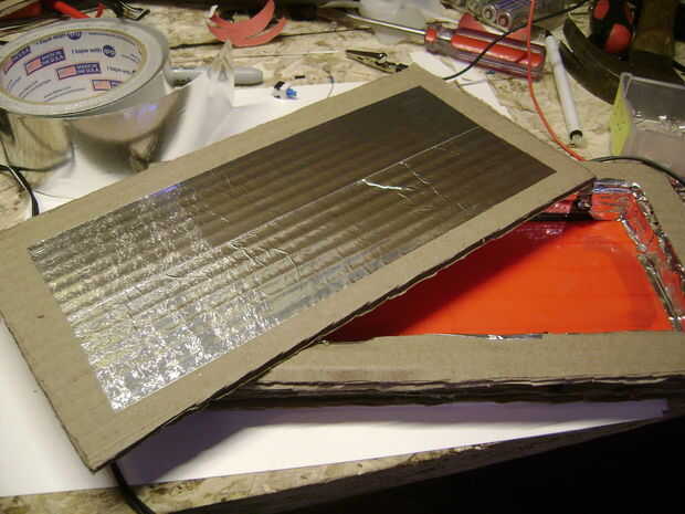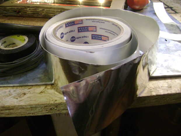 Luego tomar la parte trasera y una superficie con cinta de aluminio o papel de aluminio y pegamento de la cinta.