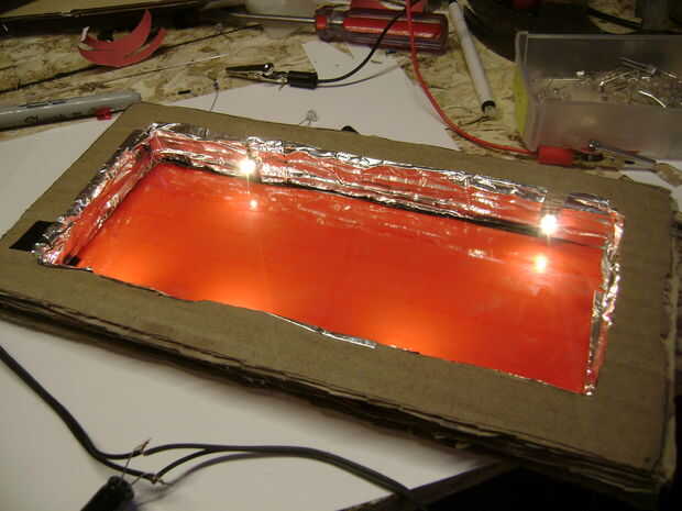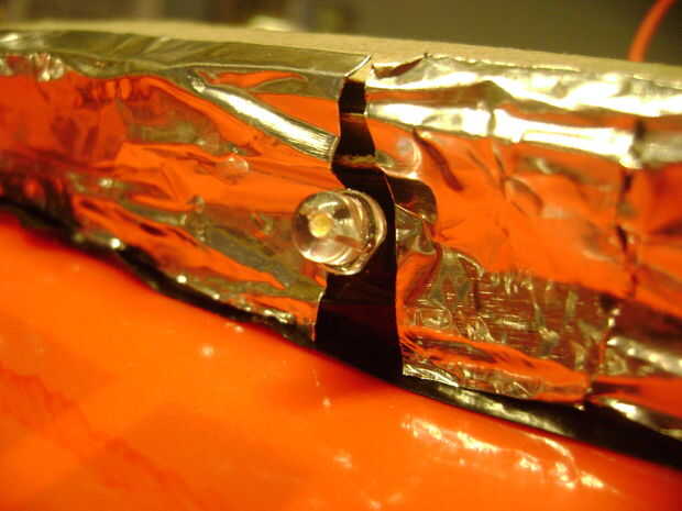 Ahora instale la cinta de aluminio o papel de aluminio en el interior de la estructura dejando el LED al descubierto con cerca de 1/4 pulgada de espacio alrededor de ellos para reducir el riesgo de crear un corto circuito.