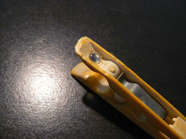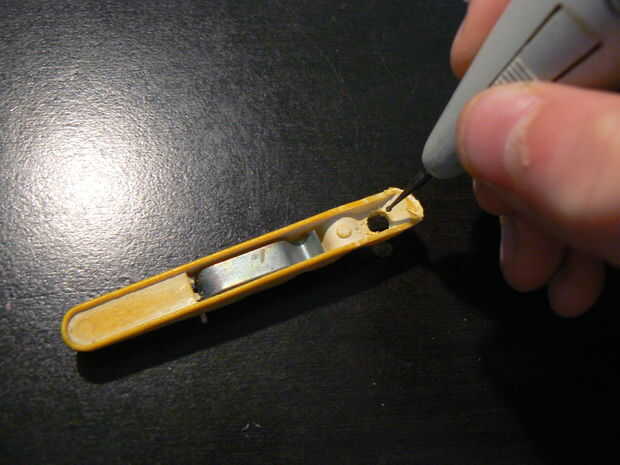 en primer lugar separe la clavija que hay pedazos. Entonces usar su grabador de taladro o herramienta de corte circular para cortar un agujero en el extremo de la clavija donde sujeta hacia abajo en (la clavija debe tener una superficie plana y allí donde sujeta, si no hay ninguna superficie plana será más difícil pero factible). Después de que el agujero ha cortado empuje la lente (no importa cualquiera de los lados) en el agujero es tan al ras con la base de la clavija. después de que la lente ha sido firmemente ranurada en afeitar la tapa de la clavija un poco para que haya más espacio para conseguir realmente cerca de la lente.