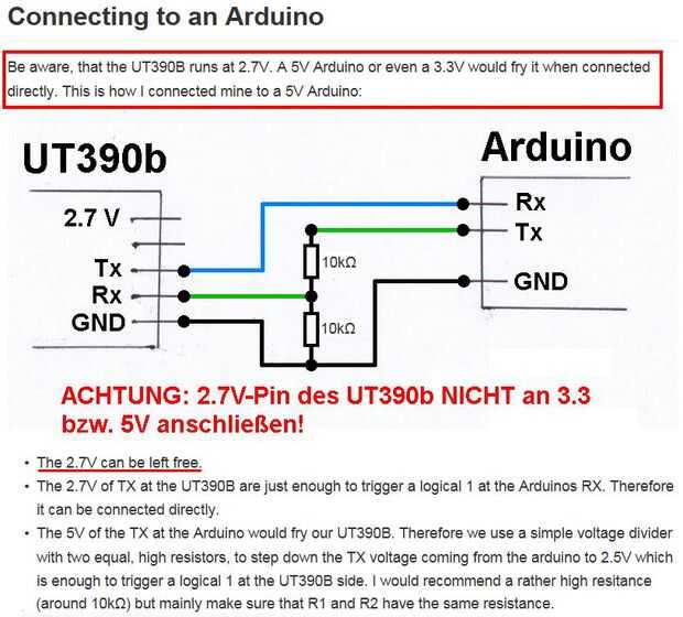 * Las señales Tx desde el arduino tienen un nivel de 5V. Esto es demasiado alta para la UT390b y puede destruir los componentes electrónicos. Por lo tanto necesita un devider voltaje con dos resistencias de 10kOhm. Los 2.7V-salida no necesita estar conectado.