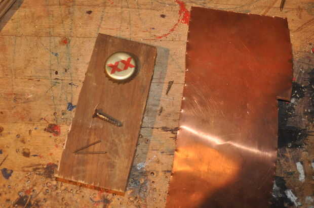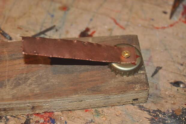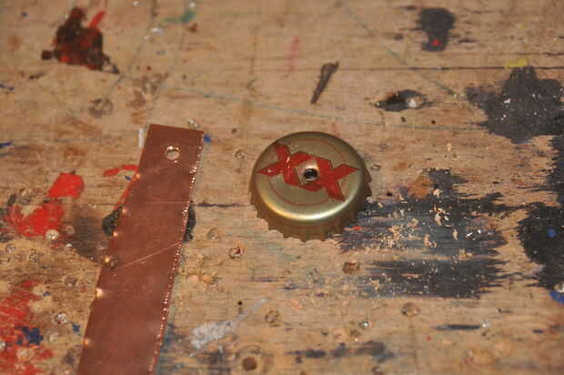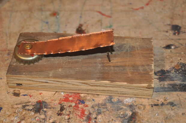 Para hacer el llave taladro un agujero en la tapa de la botella, pieza de cobre y en su base de madera.  Después, ponga el tornillo del cobre, luego la tapa de la botella y por último en la madera.  Para terminar su clave pone un clavo en su base donde al final de su cobre pieza lo que pegaron cuando presionas sobre el cobre.
