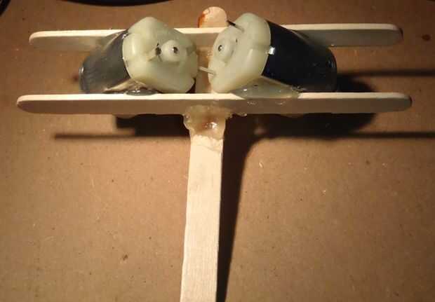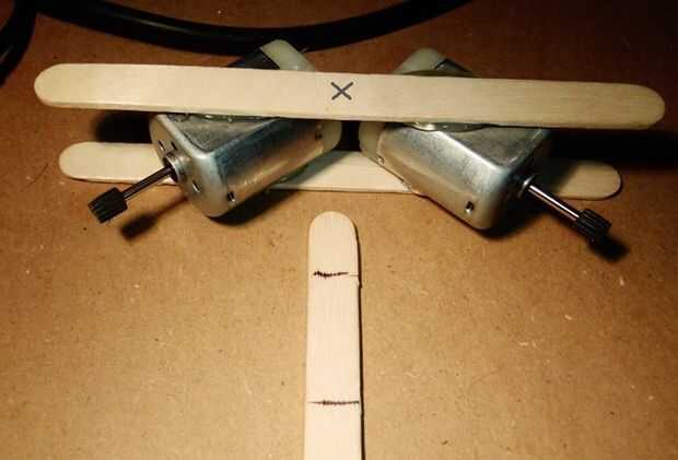 Poner un poco de pegamento caliente en cada una de estas líneas, luego balancear el ensamblaje de la carcasa del motor en el tercer palo, en las piscinas de pegamento caliente. Tienes unos segundos para comprobar el equilibrio y la alineación de este palo a la estructura antes de que el pegamento comience a endurecerse.