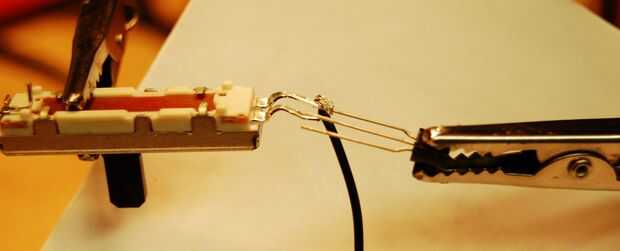 n forma similar, el pasador de la puerta a la pata correspondiente potenciómetro con un gancho de alambre de la soldadura. Es mejor para los cables a la cabeza en dirección opuesta de estos empalmes de la soldadura para que no corto cuando el robot topa en las cosas.