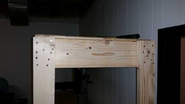 Entonces defina mis caballos de la sierra en el estante inferior a y el estante superior encima de los caballos. Entonces clavó el estante superior a los postes verticales. Para dar el estante un poco fuerza extra usé tacos debajo de la horizontal 2 x 6.