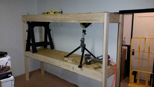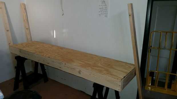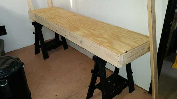 Usé los caballetes y nivelado hacia fuera el estante. Nota: usé un caballo regular Sierra y mi quijada Sierra caballo con es ajustable para hacer el nivel con el piso de sótano de hormigón inclinadas.