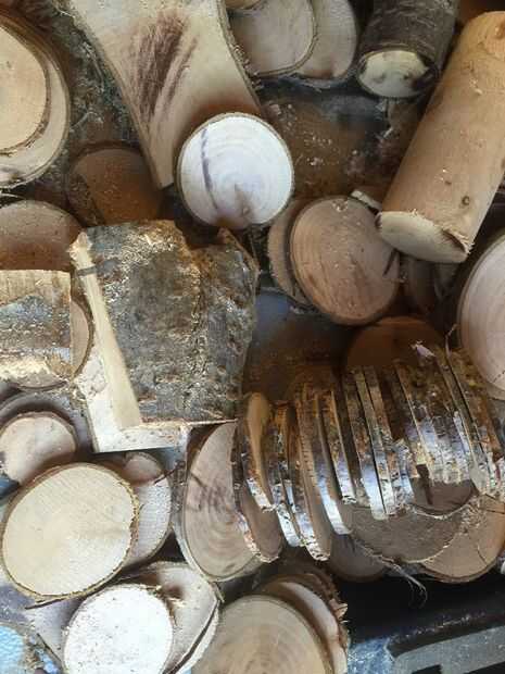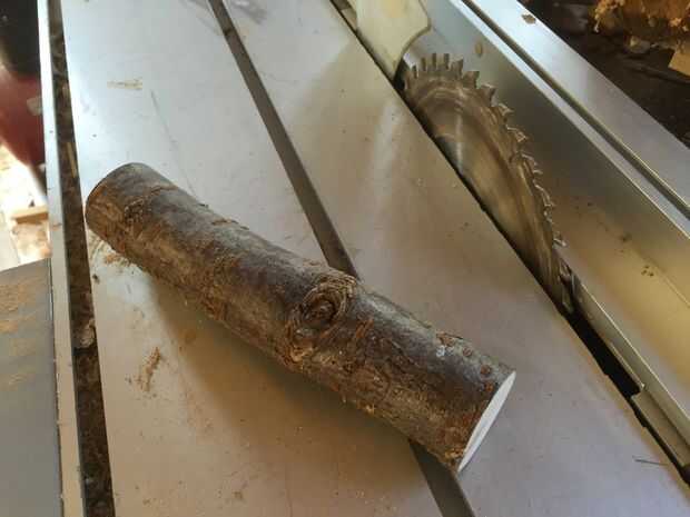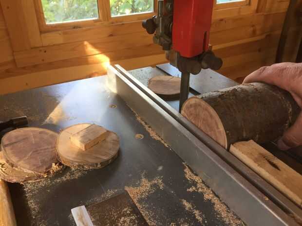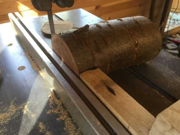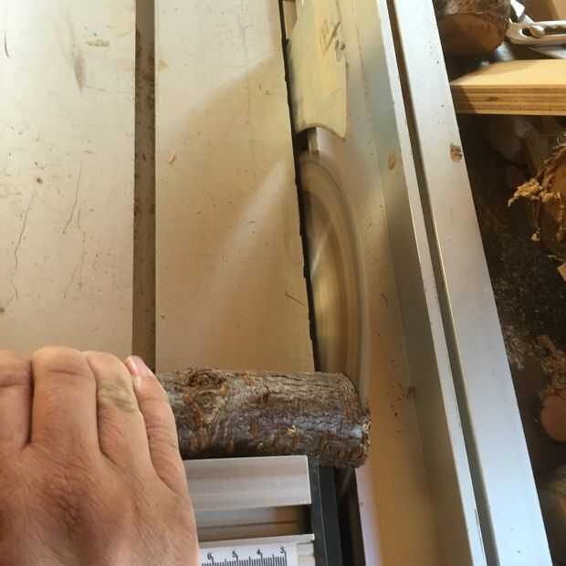 Mi preferencia es usar la Sierra de mesa y utilice el calibrador de inglete para sostener la rama a 90 grados a la hoja. Mi consejo aquí es colocar la valla cerca de la hoja y la rama hasta la valla cada vez que desea que el sector de la madera. Utilizando la guía como una parada tienes láminas de espesor constante.