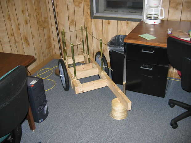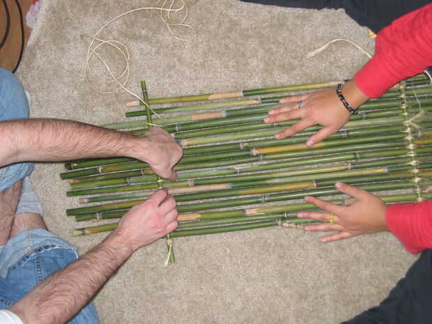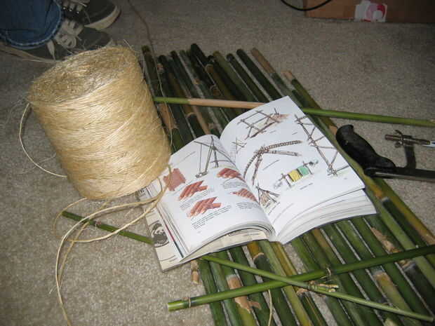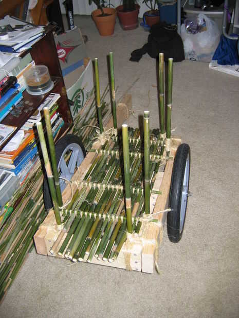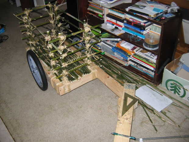 Línea de piezas suficientes para cubrir el piso de la carreta, entre los postes de bambú. Cortar los extremos de las piezas a cada lado según sea necesario para caber entre los montantes. Cortar 4 trozos de una pieza de pequeño diámetro de llaves de Cruz, y lash juntos como una balsa de bambú. Coloque el piso terminado entre montantes.