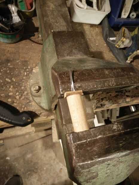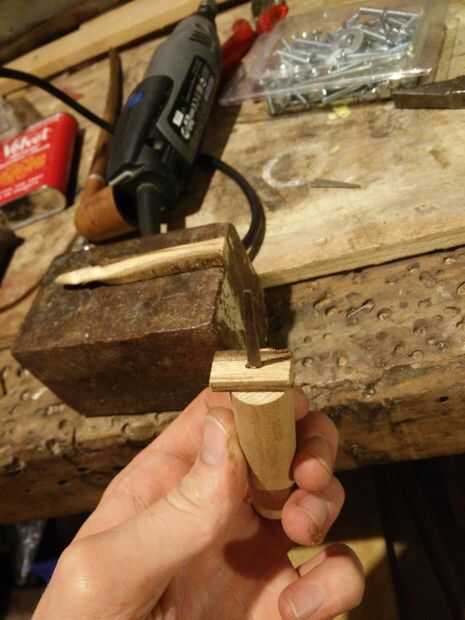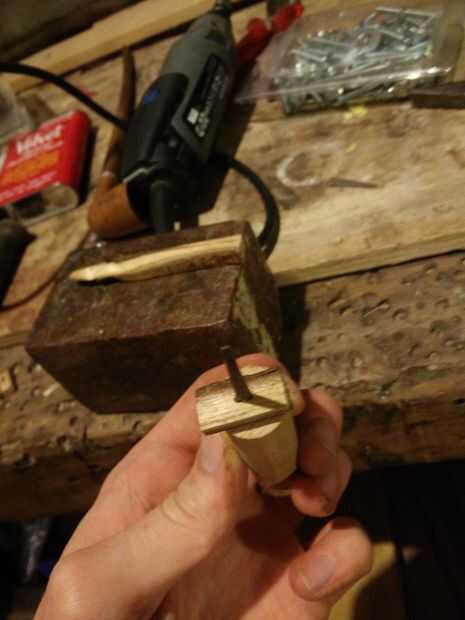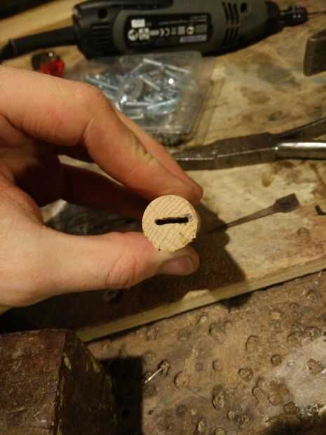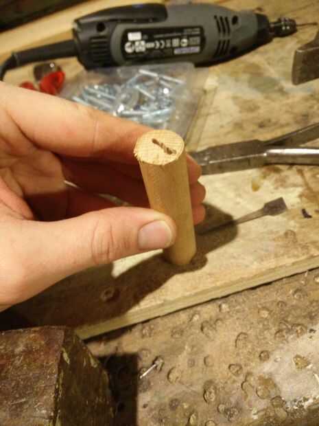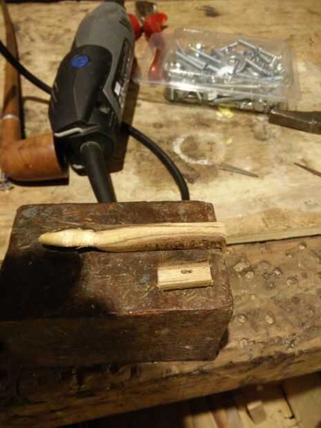 Luego lo inserta en un taco en que perforé una ranura con la dremel. He añadido un trozo de una madera diferente con un pequeño agujero para ocultar la ranura grande y hacer de un acabado de mejor aspecto. Pegué todo con epoxi 5 minutos.