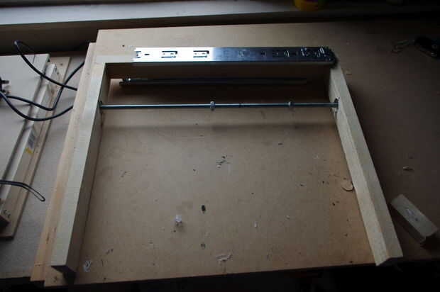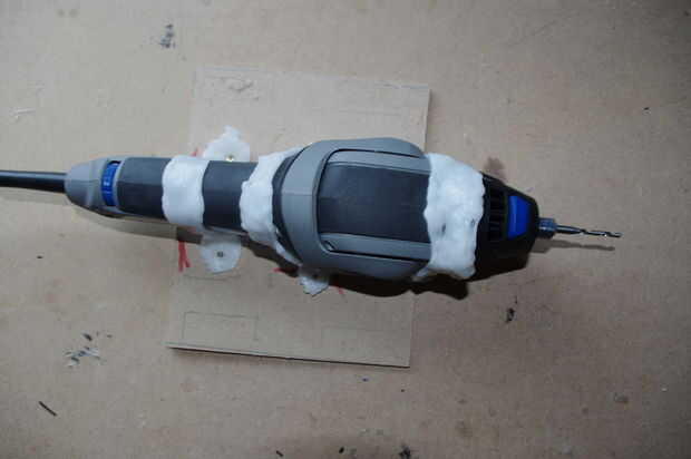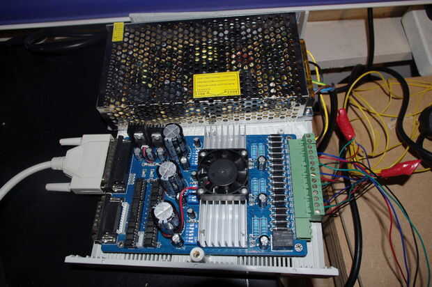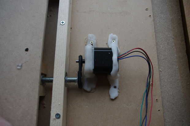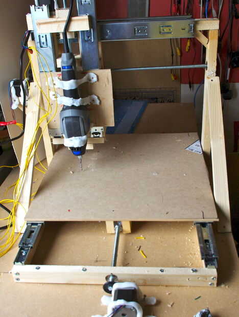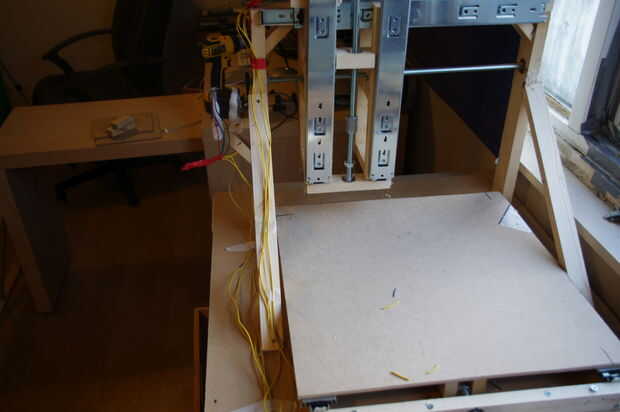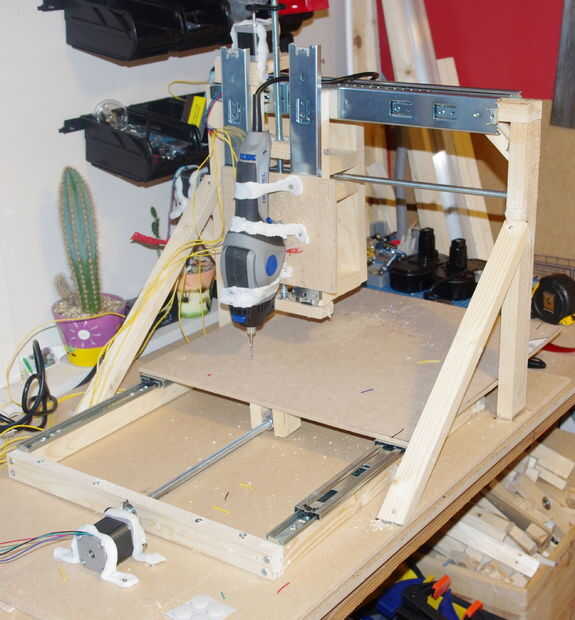 La máquina está hecha de madera aserrada, deslizadores del cajón, 17 motores paso a paso nema, un tablero de regulador TB6560 conductor y una Dremel Trio como la herramienta de fresado o corte