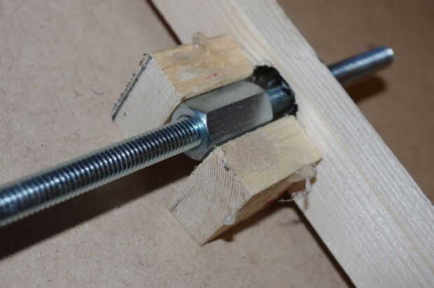 Una vez hecho esto usted necesita cortar trozos de madera para sujetar la tuerca de la mudanza. Estos pueden adjuntarse a la hoja de MDF