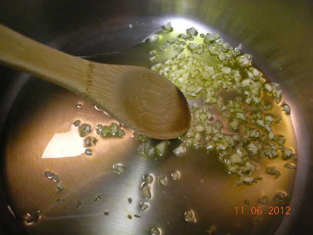 Añadir las 3 cucharadas de aceite de canola con oliva a una sartén grande. Calentar el aceite en medio y luego agregar el ajo picado. Cocinar el ajo, revolviendo frecuentemente, hasta que el ajo empiece a dorarse en los bordes. Esto le dará a la salsa un sabor agradable ajo! Tenga cuidado de no quemar los ajos, mientras se calienta rápidamente.