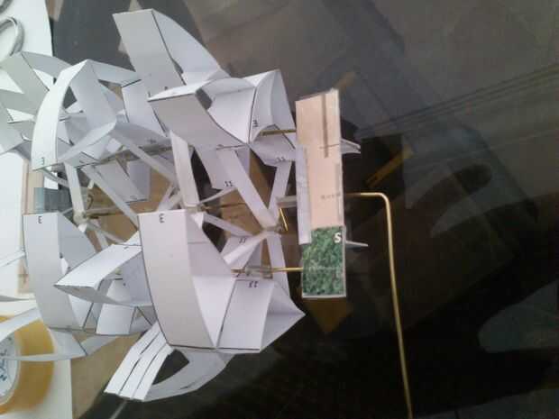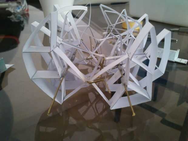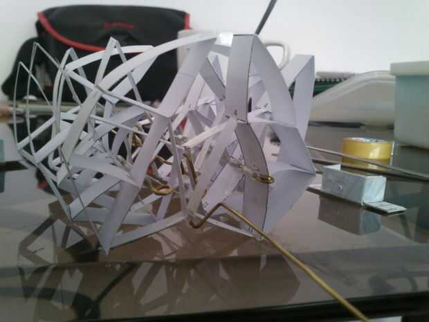 así que esto es un mecanismo Strandbeest, un mecanismo inventado por Theo Jansen, un artista holandés. Esta escultura cinética cuando mueve en una pendiente, o como en las creaciones de Theo Jansen, aprovechamiento de la energía del viento. Diseñé es