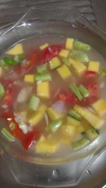 Tomar el plato en el microondas (tenga cuidado de no quemar sus manos-utilice guantes o un paño) y añadir las verduras. Escurrir el arroz y añadir también. Añadir 1 taza de agua. Añadir sal al gusto. Mezclar una vez.