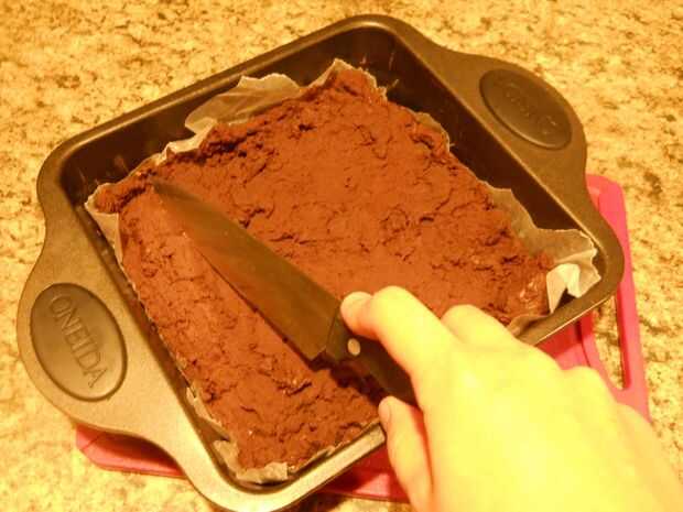 Después de aproximadamente dos horas en la nevera el fudge debe establecer. Ahora usted puede cortar para arriba y comer!